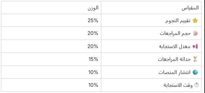 مثال: إذا كانت أعمالك مدرجة على 4 منصات، لكن فقط 2 منها تحتوي على مراجعات، يكون معدل انتشار المنصات 50% بدلًا من 100%.