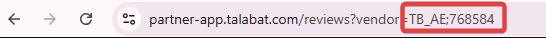 الحصول على معرف البائع (Vendor ID) من تطبيق شركاء "طلبات": تأكد من إمكانية الوصول إلى حساب تطبيق شركاء طلبات (Talabat Partner App) وجميع الفروع التي ترغب في دمجها. ستحتاج إلى ذلك للحصول على معرف البائع لكل فرع ترغب في سحب تقييماته.