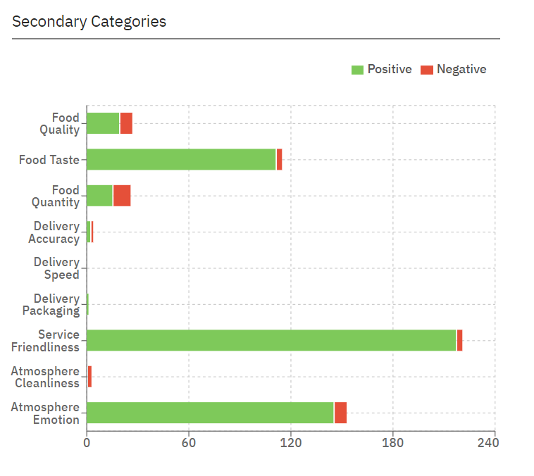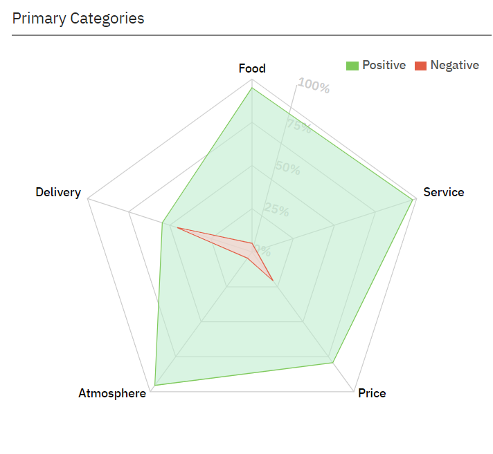 Automatically categorizes feedback into topics like Delivery, Food, Service, Atmosphere, and Price