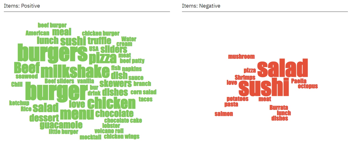 See what customers mention most—menu items, services, or experiences—sorted by sentiment.